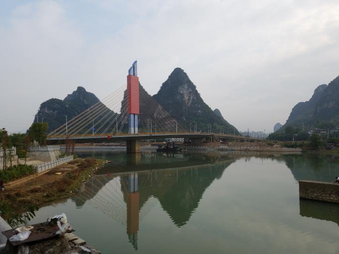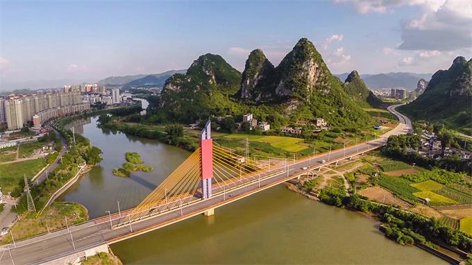 賀州市靈峰大橋工程位于八步區(qū)賀江一橋下游0.9公里處,北岸接靈峰北路,是連接賀江兩岸、緩解城市交通壓力、方便居民的重要通道之一。靈峰大橋設(shè)計(jì)全長(zhǎng)為465.018米,其中南引道長(zhǎng)50.448米,北引道長(zhǎng)80.570米,引道全長(zhǎng)131.018米,橋梁長(zhǎng)度為334米,橋面寬度27米,按雙向四車(chē)道設(shè)計(jì)。主橋采用獨(dú)塔單索面預(yù)應(yīng)力混凝土展翅箱梁斜拉橋,邊跨跨徑68米,主跨跨徑86米,全長(zhǎng)154米。橋面以上塔高51米,全橋設(shè)計(jì)共有77根樁基、9個(gè)承臺(tái)、7個(gè)墩身、2個(gè)橋臺(tái)。