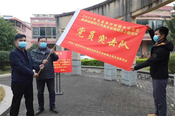隨后,活動人員來到了賀州市檢察院生活小區(qū),該小區(qū)是正贏實業(yè)公司負(fù)責(zé)實施的賀州市2022年市直單位城鎮(zhèn)老舊小區(qū)基礎(chǔ)設(shè)施和公共服務(wù)設(shè)施提升工程項目其中一個老舊小區(qū)。在老舊小區(qū)現(xiàn)場,支部開展了黨員對標(biāo)承諾活動,并成立了2022年市直單位老舊小區(qū)基礎(chǔ)設(shè)施和公共服務(wù)設(shè)施提升工程項目“黨員突擊隊”。柳國忠強調(diào),全體黨員要通過向身邊的優(yōu)秀黨員學(xué)習(xí)并從中確立標(biāo)桿和榜樣,在項目建設(shè)中以黨員的標(biāo)準(zhǔn)嚴(yán)格要求自己,帶頭攻堅克難,沖鋒在項目一線,更好的為人民群眾服務(wù)。