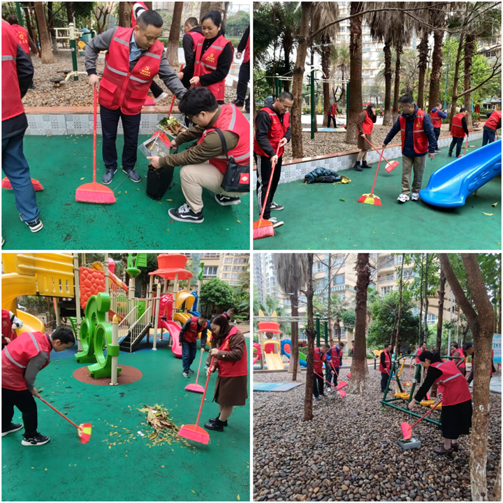 活動(dòng)中,支部黨員與社區(qū)志愿者們分工協(xié)作,干勁十足,深入衛(wèi)生死角,拿起掃帚等工具清理居民小區(qū)健身器材區(qū)與孩子們游樂(lè)區(qū)散落的枝葉與垃圾。在志愿者們的共同努力下,健身區(qū)與游樂(lè)區(qū)煥然一新,提升了人居環(huán)境質(zhì)量,得到了小區(qū)居民的點(diǎn)贊,形成了“黨建引領(lǐng)、鄰里協(xié)力、共建幸福”的良好局面。